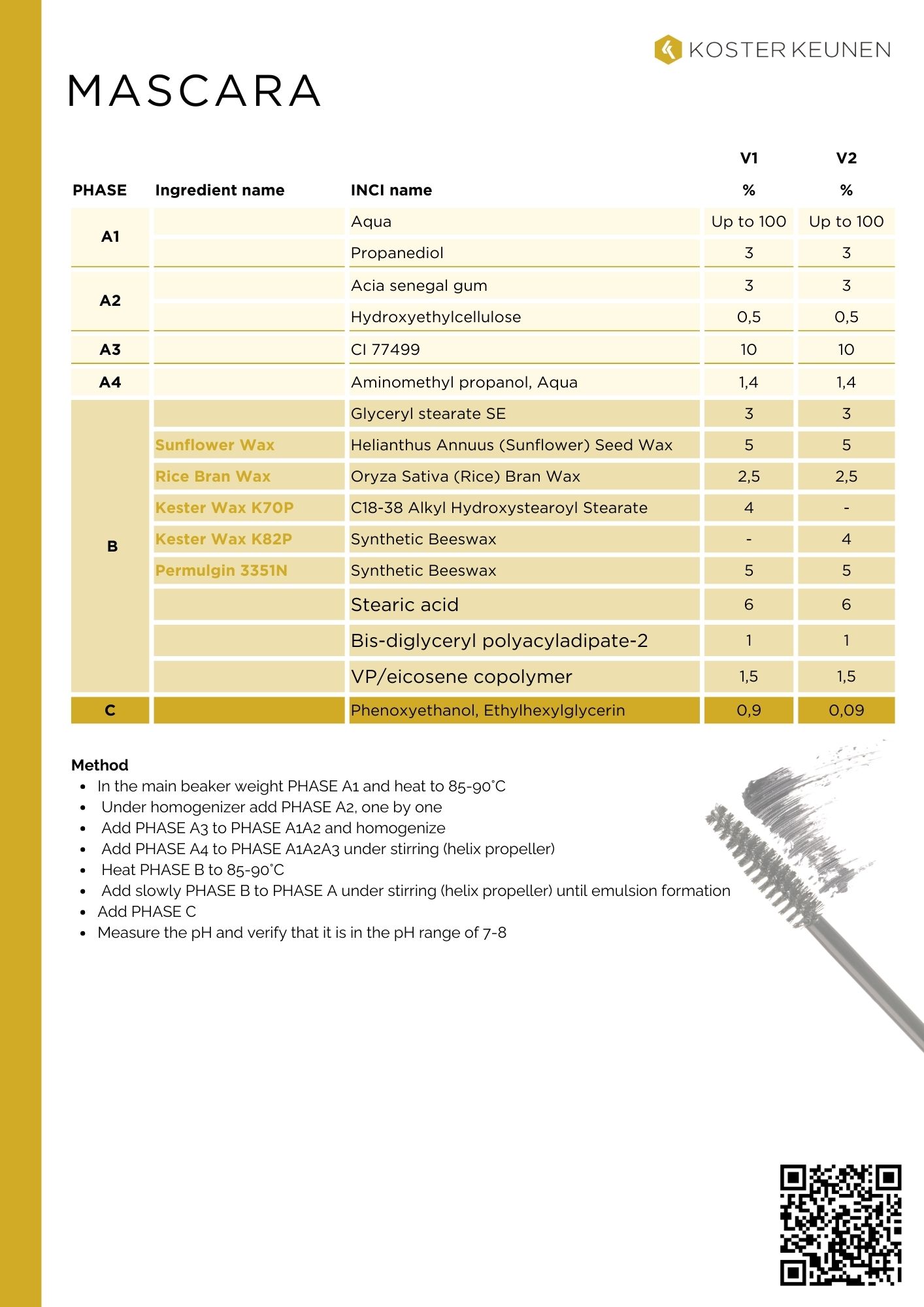 This mascara formula combines the power of plant-based waxes; Sunflower and Rice Bran Wax with specialty plasticizing Kester Waxes (K82P and K70P) for exceptional lash definition and performance. This unique wax blend creates the perfect balance of flexibility and hold, delivering dramatic length and volume that lasts all day without flaking or smudging.